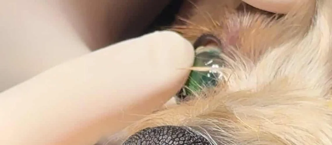 Stellar Vets Littlehampton treats a stubborn corneal ulcer in a dogs eye with surgical debridement and a contact lens.